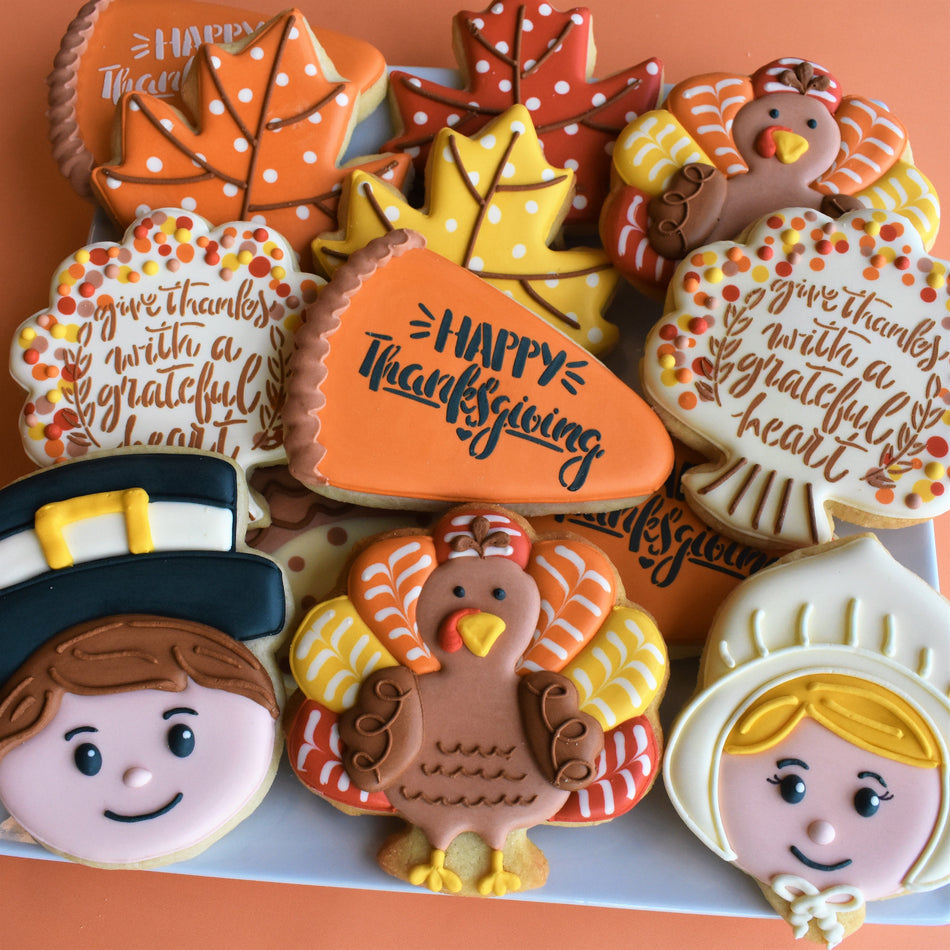 Gratitude is such a big part of my life and I think that is why I love Thanksgiving so much! I love the food, my family, and of course I love making Thanksgiving cookies! In today's tutorial, I'm going to show you how to make turkeys, pilgrims, pie slices, trees and leaves - OH MY!! Grab the decorating kit for the essential cutters and stencils to recreate these tasty masterpieces!