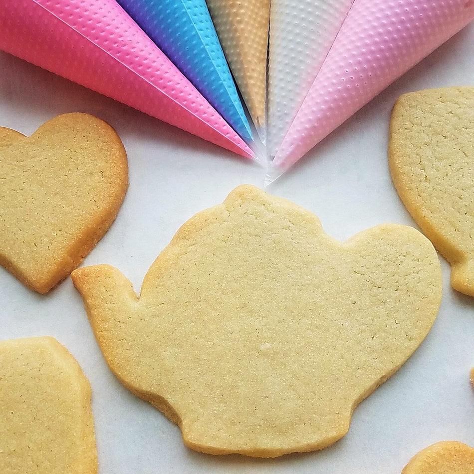 With a single batch of dough I made 35 cookies: 5 Teacup, 5 Teapot, 5 Teabag, 10 Crossiant, and 10 Mini Hearts. The last three cookies are small, so I had a higher than normal cookie yield! I should note that I roll my cookies to 1/4" thick using the Dough EZ Rolling Mat System. The thickness of your cookies will impact your yield.
