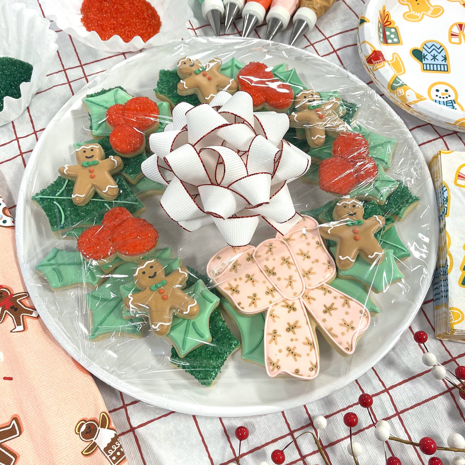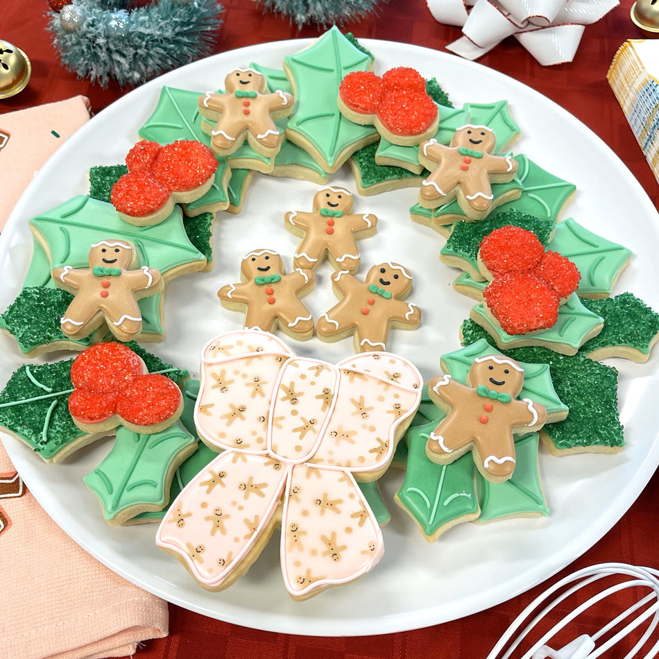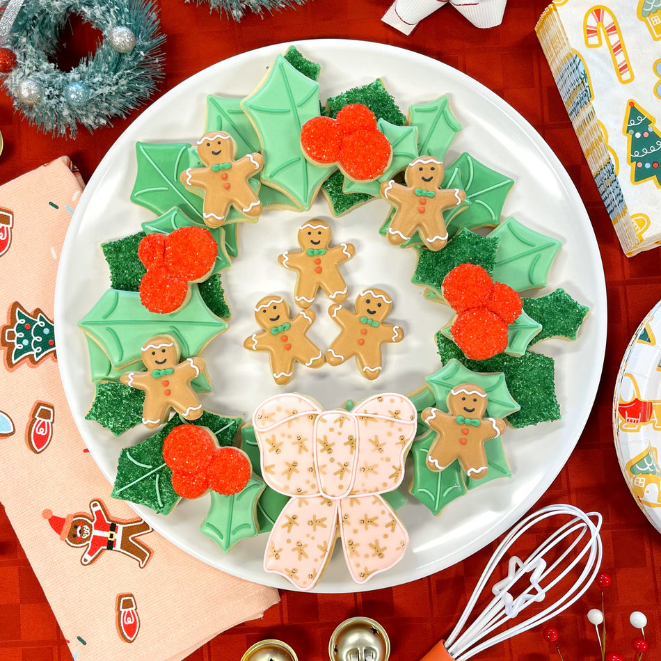 Pick up the Kit! It's got the essential cutters and stencils and a few bonus tools! Recreate these Christmas Wreath Cookies with this kit. There are so many FUN goodies in this box! This kit includes: FIVE (5) cutters: Wreath Centerpiece 4pc Cookie Set (Small Holly, Large Holly, Holly Berries, and Bow), Mini Gingerbread Man Cookie Cutter, Scattered Gingerbread Stencil, Christmas Red Green and White 3-Cell Sanding Sugar, Boo Boo Stick, 10 Tipless Bags (5 10" and 5 13")! **kit does not include standard decorating supplies like ingredients, standard tips like #2, or food gels. These need to be purchased separately. See a list below.