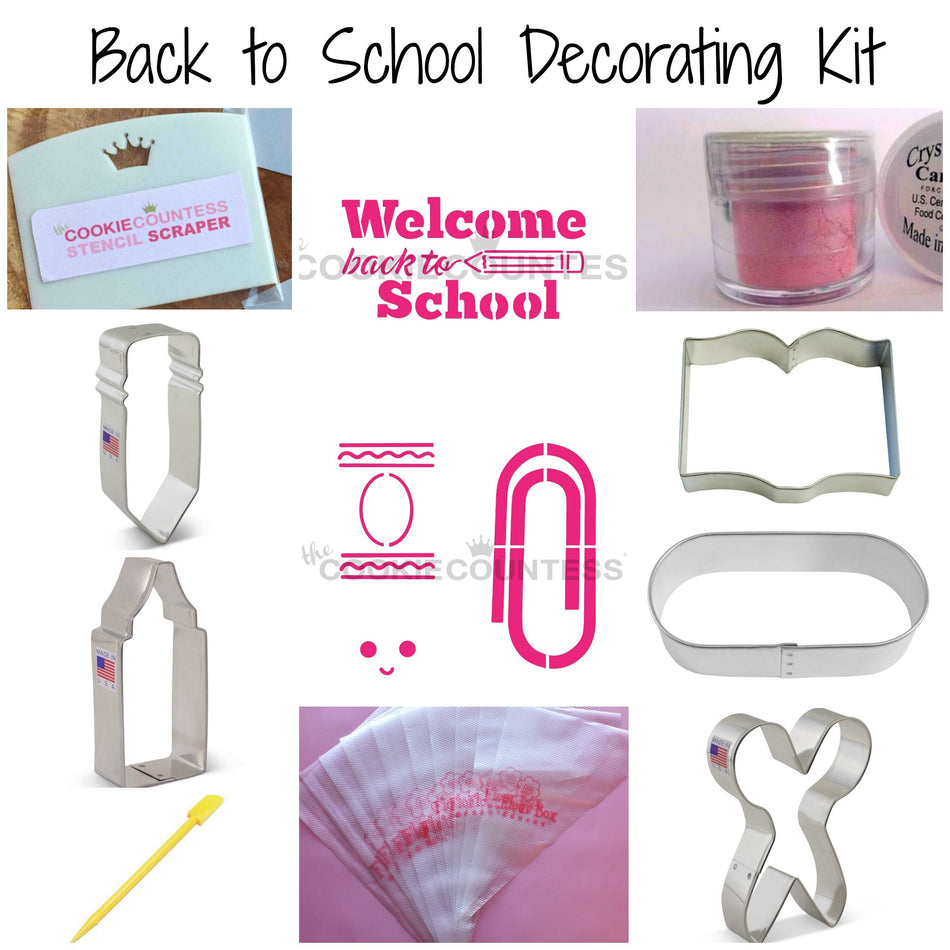 There are so many cutters, stencils and tools in this box! This kit includes: FIVE cutters (Crayon, Pencil, Scissors, Book, and Pill/Paperclip), Welcome Back to School Stencil, School Tools Stencil, Single Scraper pack, 1/4 oz Carnation Pink Crystal Color, Boo Boo Stick, 10 Tipless Bags (5 10" and 5 13")! (**kit does not include standard decorating supplies like ingredients, food safe brush, standard tips like #1 or #2, or food gels. These need to be purchased separately.)